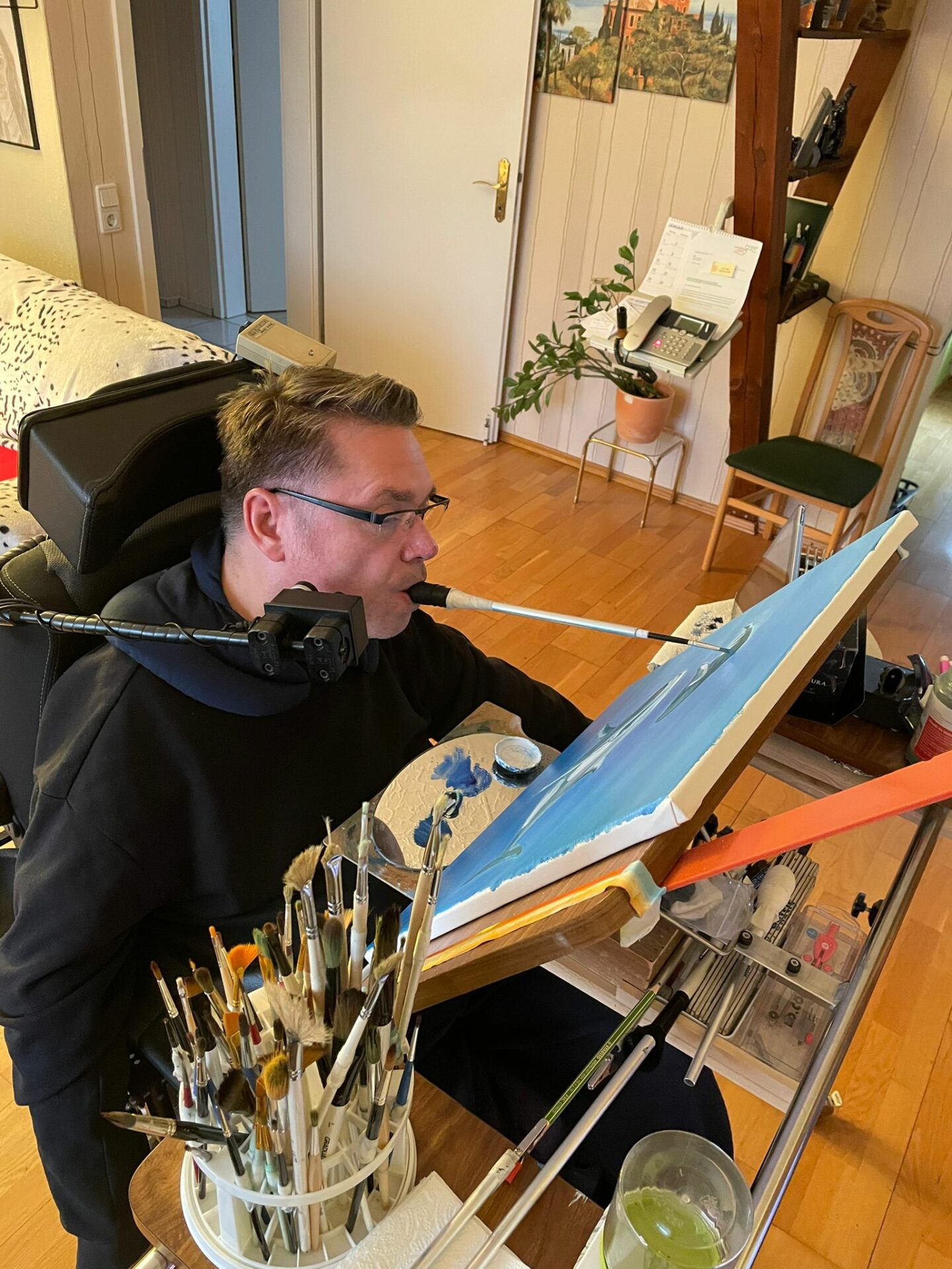 Da Dirk Bennewitz schon vor seinem Unfall gern gezeichnet und gemalt hat, interessierte er sich weiterhin für die Kunst des Malens. Deshalb hat er sich über viele Jahre Videos über das Mundmalen angeschaut. Den endgültigen Anstoss, es selbst zu versuchen, gab ihm seine Partnerin. Seither malt er mit selbstgebauten Mundstäben, mit Zeichenkohle, Acryl und Ölfarben.