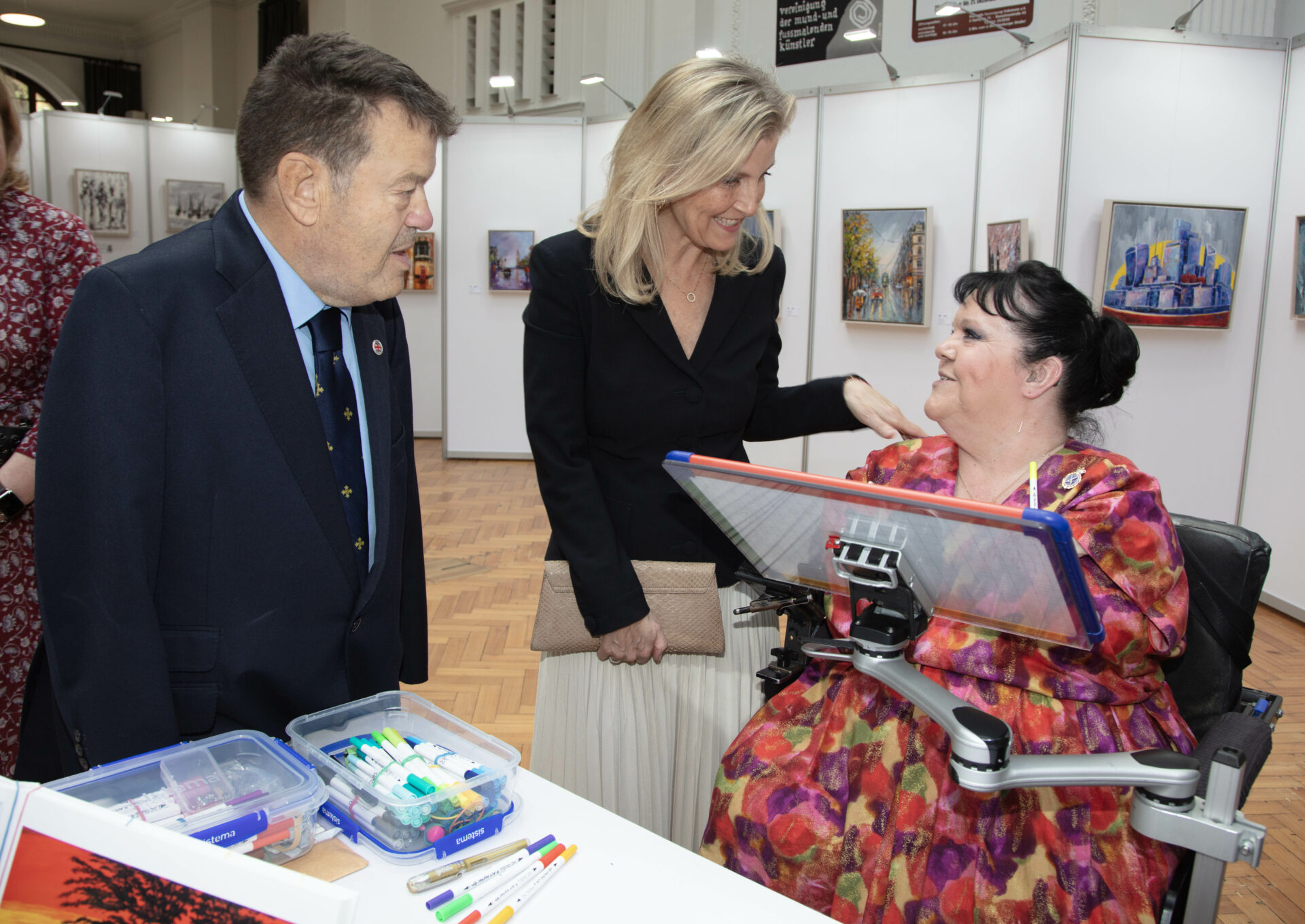 Un momento especial fue la visita de Sophie, Duchess of Edinburgh, quien asistió a la exposición “Defying Limits, Defining Art: 70 Years of the Mouth and Foot Painting Artists” y expresó su reconocimiento a los artistas presentes.