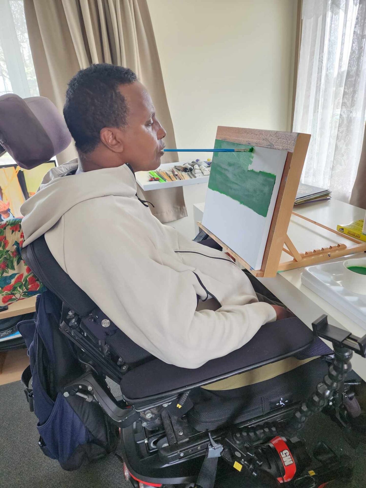 Abdifatah Hussein Sheikh nació en Mogadiscio, Somalia, el día 1° de enero de 1969. A la edad de 26 años emigró de Somalia a Nueva Zelanda. A los 31 años tuvo un accidente que le dejó tetrapléjico. En el año 2002 sus amigos le alentaron a que comenzara a pintar. Luego atendió a cursos de pintura extraescolares en la Spinal Unit de Otahuhu, Auckland. Al principio le pareció demasiado difícil pintar con la boca y casi lo habría dejado, pero siguió adelante gracias al apoyo de sus amigos. Entendió paulatinamente el proceso del pintar y obtenía más confianza al aplicar el color enfocándose y concentrándose mucho. Pasó a imponerse nuevas metas en materia de pintura. Sus cuadros muestran su tierra natal y disfruta los recuerdos que resucitan en él.