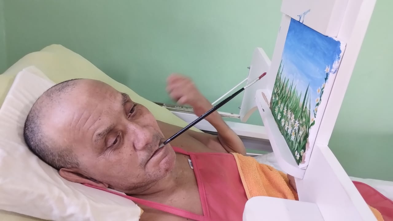 Sebastião Batista de Jesus, nacido el día 21 de enero de 1971, es tetrapléjico desde 1994 después de haber sufrido un grave accidente a la edad de 24 años durante un partido de futbol. Debido a sus lesiones, no puede permanecer sentado ni moverse independientemente y la función de sus brazos y manos está muy limitada. Después del fallecimiento de sus padres y dos de sus hermanas, vive solo desde 2019 y depende del apoyo de parientes y amigos y donativos de su comunidad para cubrir sus necesidades sanitarias y cotidianas. A pesar de sus circunstancias de vida difíciles, en noviembre de 2023 Sebastião Batista de Jesus tuvo la oportunidad de comenzar a pintar a través de un amigo que es Miembro de la Asociación Mundial de Artistas Pintores con la Boca y con el Pie. Esta nueva actividad no sólo es una distracción para él, sino también una motivación importante para mejorar su calidad de vida.